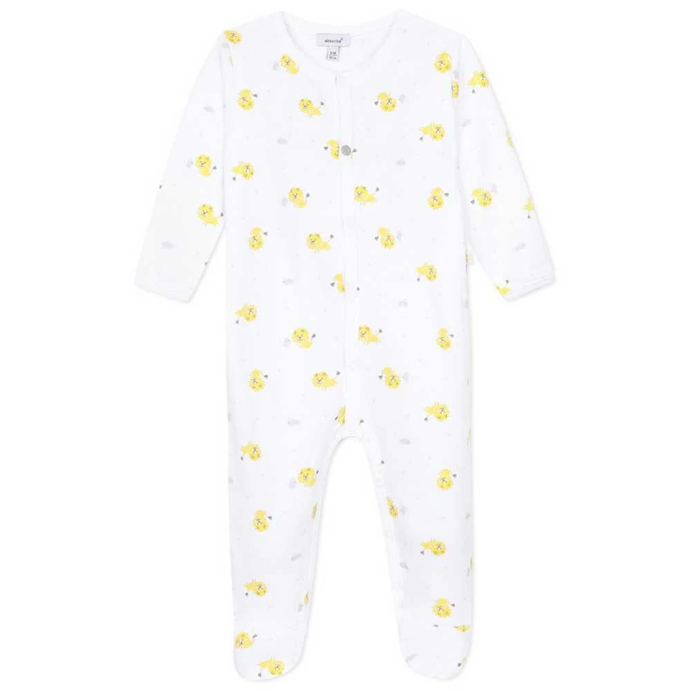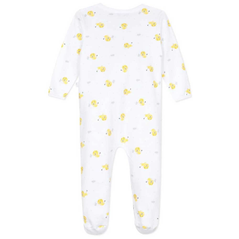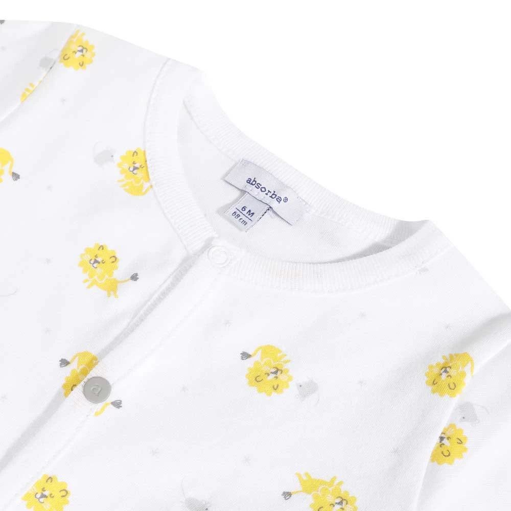 A onesie in white cotton knit dotted with a print of yellow lions and grey mice.