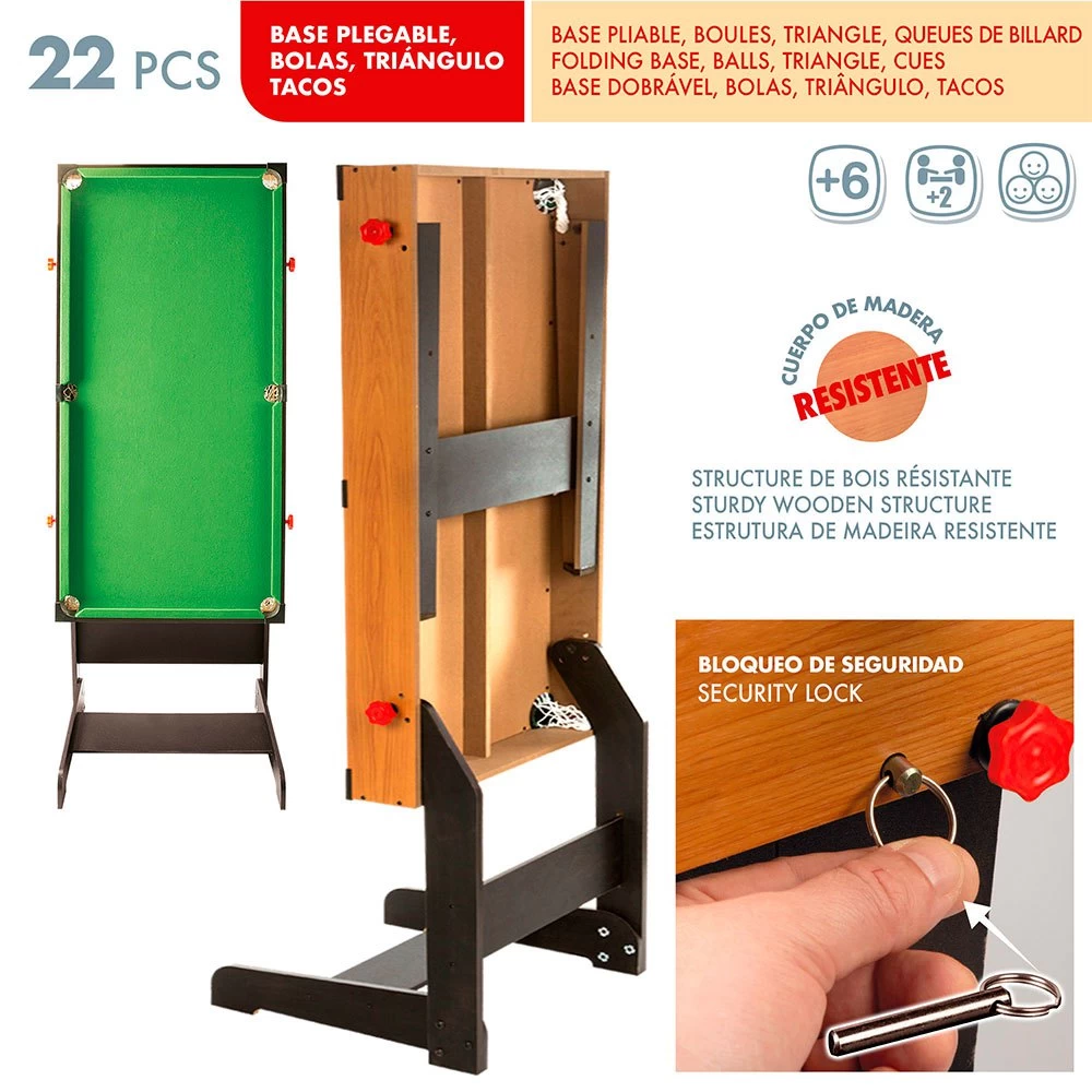 The billiard measures 101x51x70 cm and has 2 safety locks to fold it.