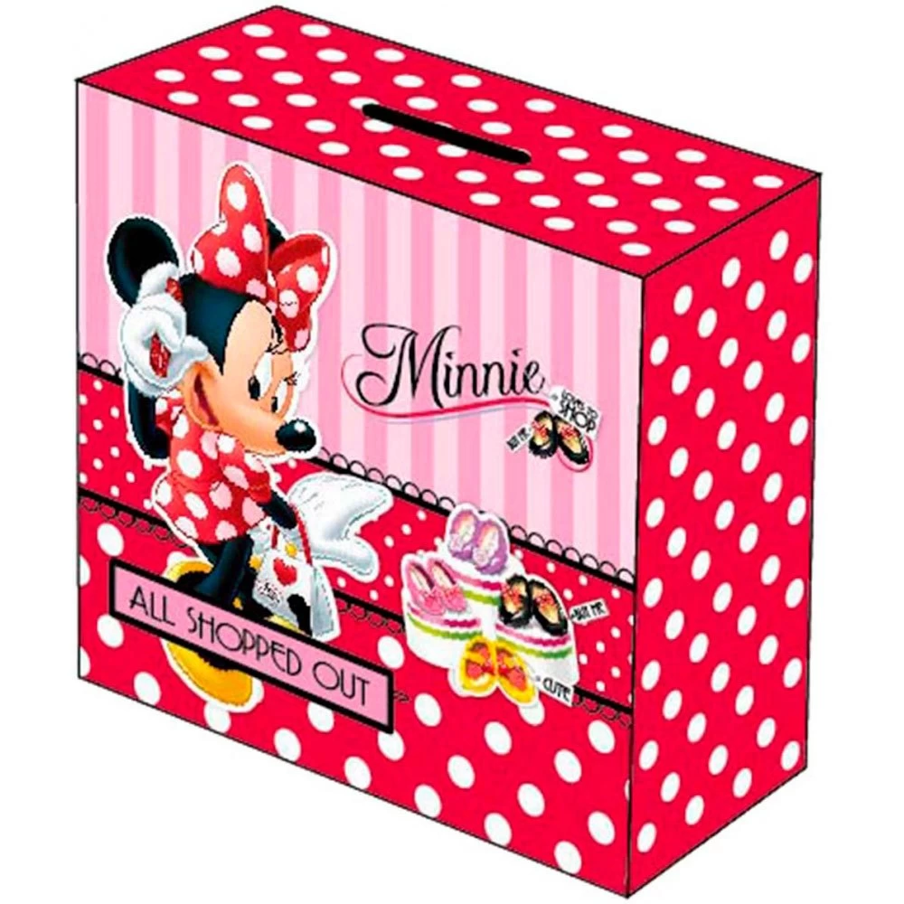 Disney Minnie Wooden Hucha with a rectangular shape of 14×11 cm that occurs in a red and pink design with white and frontal booths decorated with the minnie mouse drawings in bright colors.