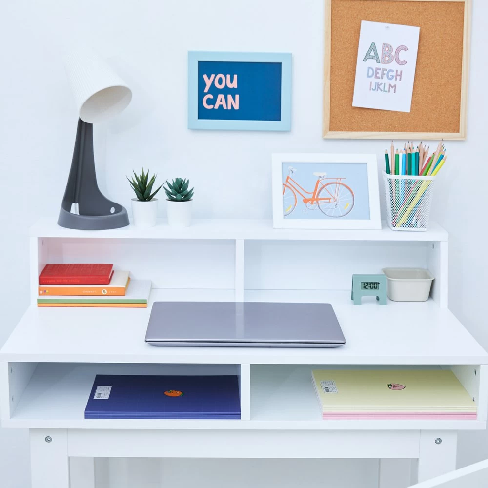 AMPLE STORAGE: 2 storage compartments above the desk and 2 hidden sections underneath the table are perfect to use as bookshelves, storage for notepads, craft or school supplies and more! The top shelf alllows for your little ones to showcase any decor they wish.