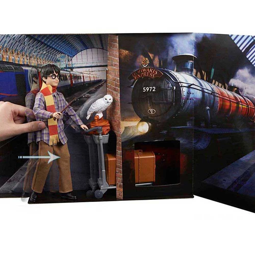 This collectible Harry Potterâ„¢ doll invites fans to join the young wizard on his first ever journey to Hogwartsâ„¢! Inspired by an iconic scene at Platform 9 3/4â„¢, Harry Potterâ„¢ doll features a travel look and storytelling pieces, like his owl Hedwigâ„¢, a luggage cart and a suitcase fans can decorate with an included sticker sheet.