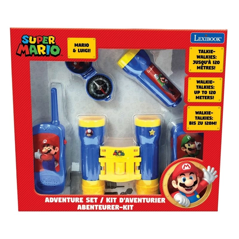 Complete set of adventures to play with Super Mario n thanks to walkie talkies, binoculars and a compass! Binoculars so you can see further A compass to find your way (simulation toy) A torch so the adventure can continue day and night or to send coded messages to your friends.