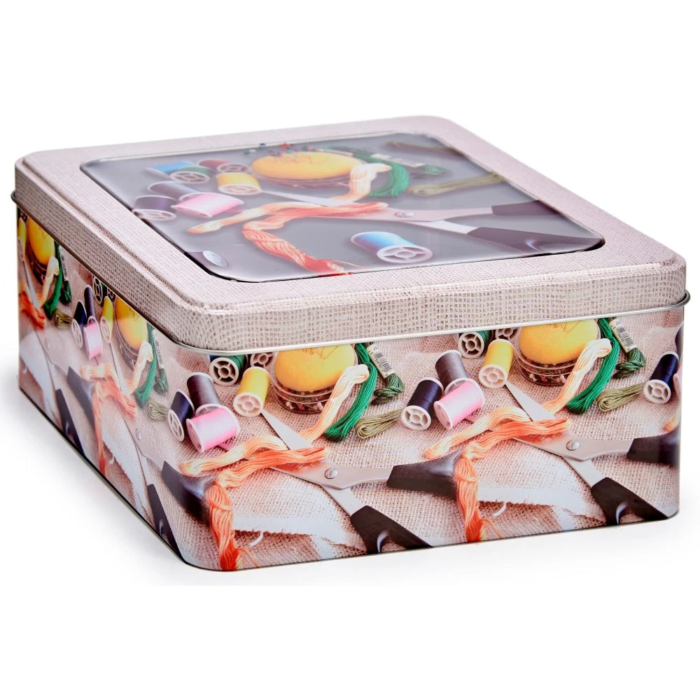 Metal box with semitransparent window and sewing theme.
