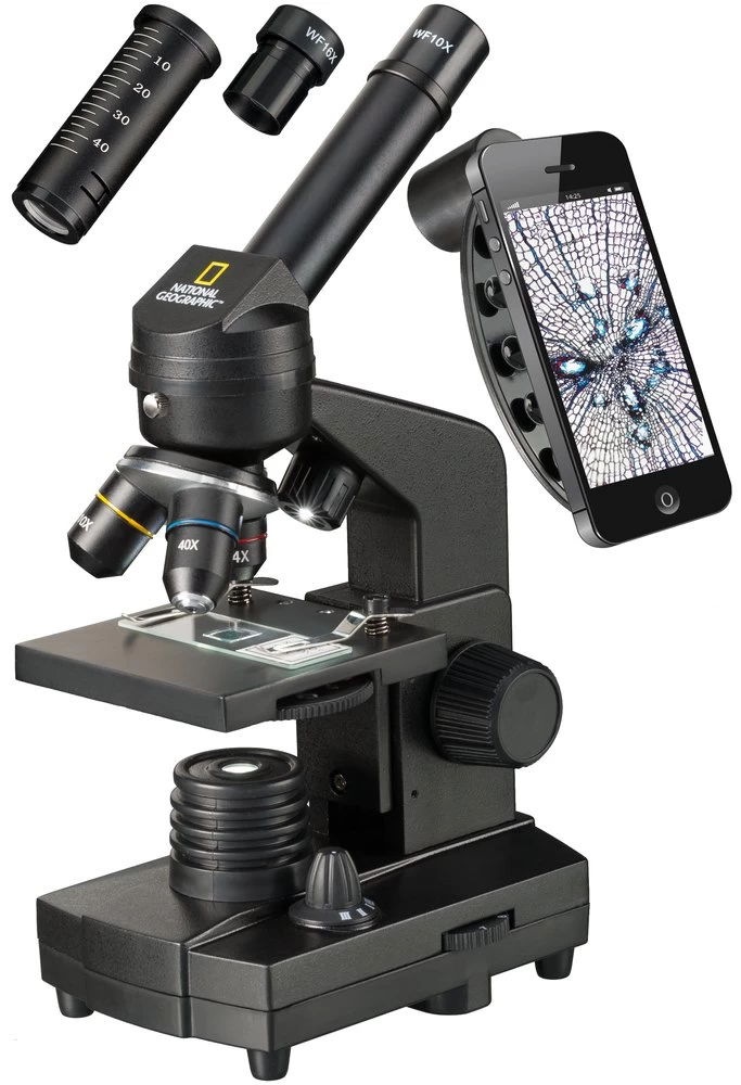 This NATIONAL GEOGRAPHIC 40×1280 reflected and transmitted light microscope is a perfect device to get an excellent access into the world of microscopy. Due to many exclusive accessories like a set of dissecting instruments or a seperate electronical eyepiece, you can expand your beginner´s model. Furthermore, a smartphone holder gives the possibilty to make pictures of your observations with your smartphone.