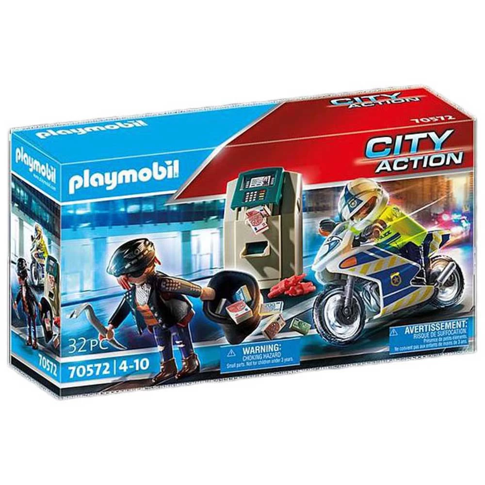 – Under the cover of darkness, a pickpocket has broken into an ATM, now he flees with the prey. But a fast police officer has already taken up pursuit with his motorcycle. This thief will not get far! The playset contains two PLAYMOBIL figures, a motorcycle, an ATM, a crowbar, a sack, banknotes and many other extras.