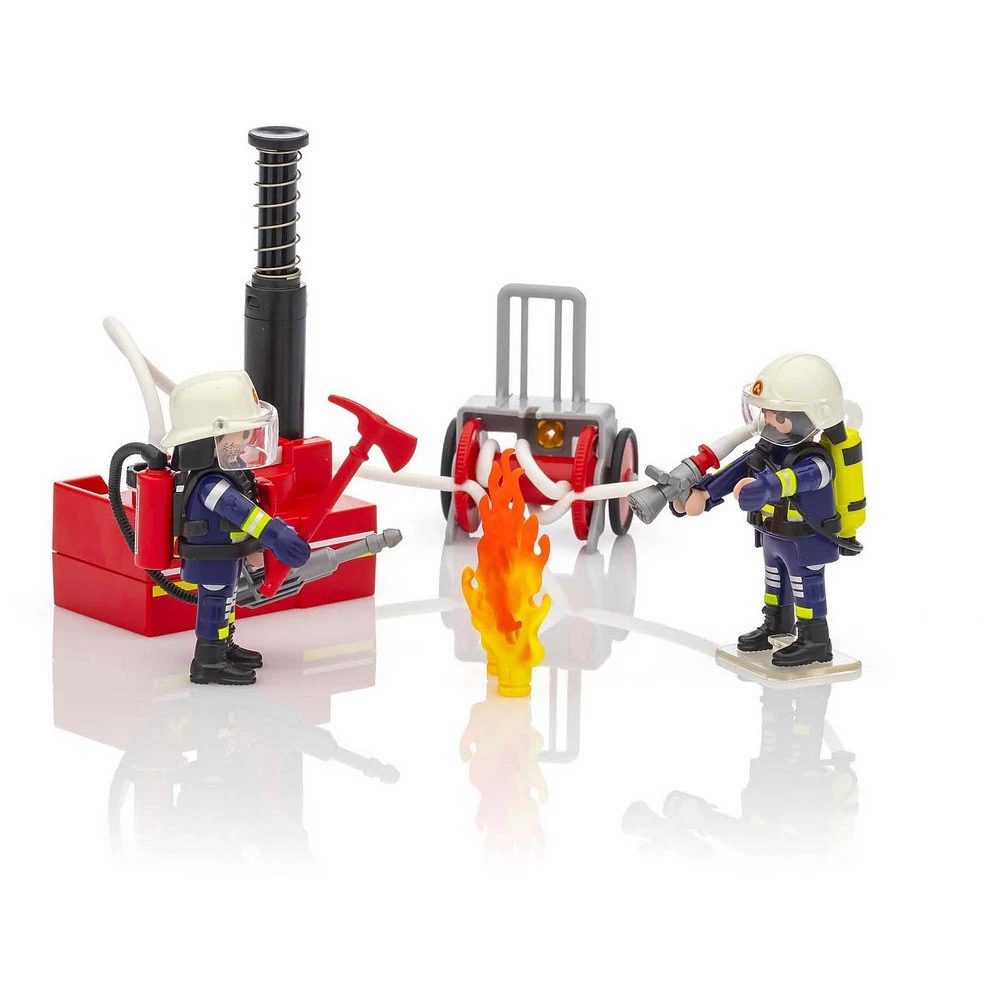 – Two firemen Accessories: 1 fire pump, 2 carrying racks, 1 breathing apparatus with hose, 1 fire extinguisher with hose and jet pipe, 1 jet pipe, 1 short axe, 1 long axe, 2 flames, 4 hoses, 2 connectors, 1 hose reel, 1 stand plate, 2 firefighter helmets with visor, 2 pairs of gloves