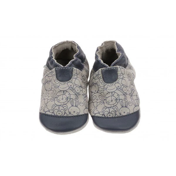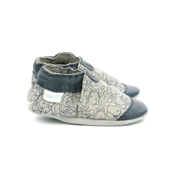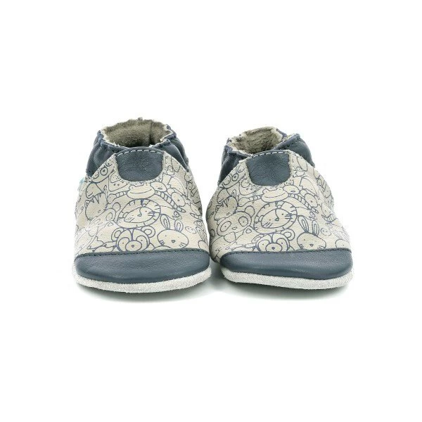 The Animal Stories model is a pair of soft booties for baby boy with a grey and navy leather upper and a leather and textile lining. The model Animal Stories grey and navy adapts perfectly to the foot of your baby while protecting him thanks to its flexible leather sole and its elastic closing which makes it possible to slip it on easily, while ensuring a good support to the ankle. Treat yourself on the Robeez website, returns are free!