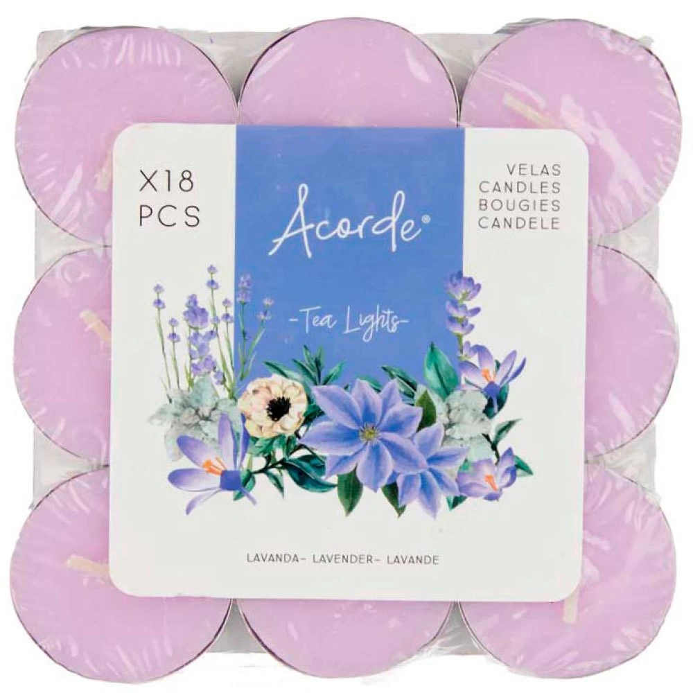 Set of 18 tealight candles with lavender scent in lilac color.