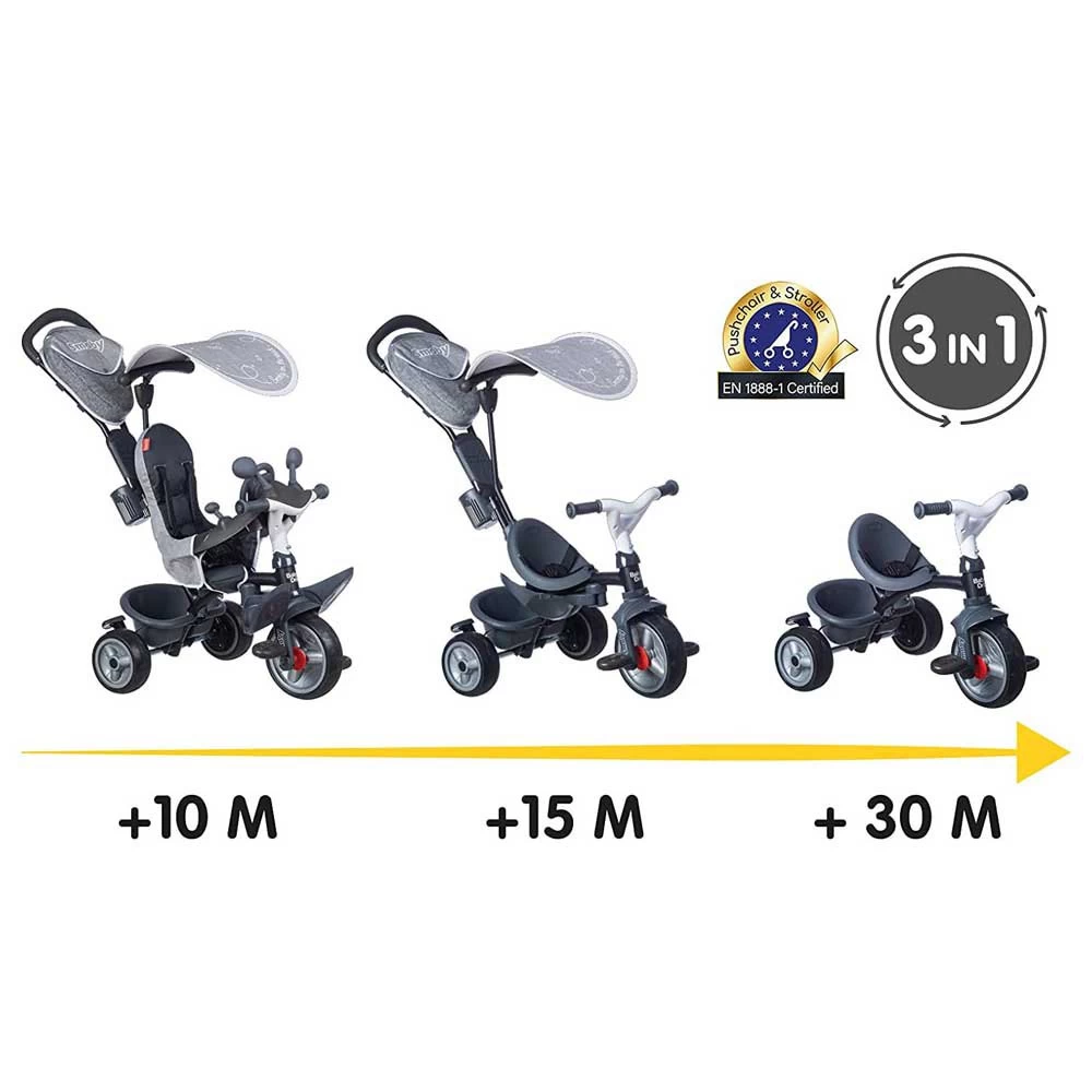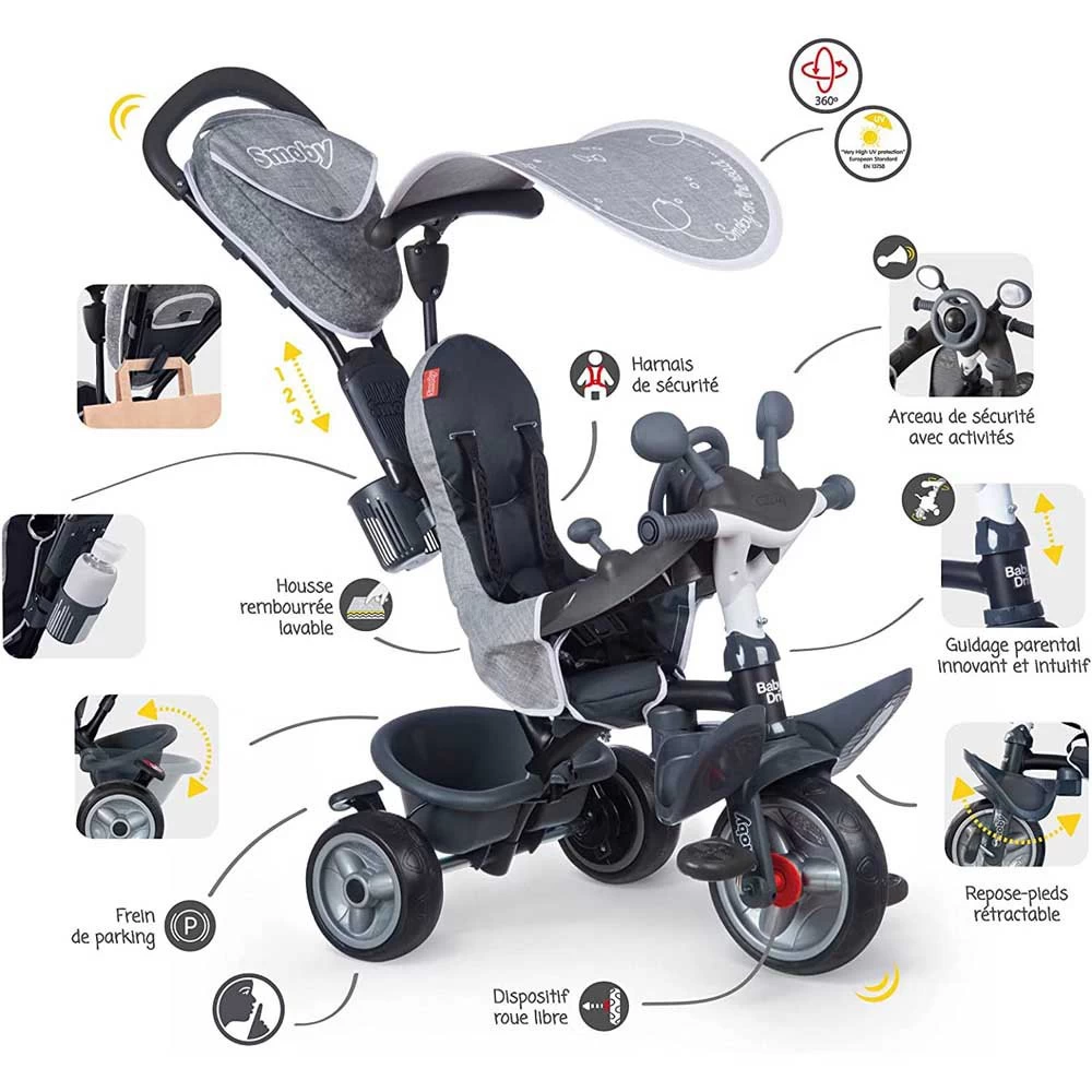 The Baby Driver Plus trike will accompany your child from 10 months to 3 years old and over! Combining safety, comfort and fun, it is ideal for all your walks! This new ´´Plus´´ version is Pushchair & Stroller EN 1888-1 Certified. It is equipped with a parking brake and a higher backrest, for even more safety. From 10 months your little-one will be comfortably seated on the removable and washable stuffed cover. A 5 points safety harness as well as ergonomic and retractable footrests are included. Your child will also enjoy the walks while having fun with the steering wheel, horn, wing mirrors, gear lever, and mechanical key.Your many walks will be pleasant and peaceful, especially thanks to the silent wheels (EVA) and steering system: A light pressure on one side or the other of the parental handle makes it possible to turn the front wheel! You could easily transfer the parent’s control to the child and vice versa. A parking brake is also included. The free wheel system will prevent some injury and will enable your child to use the pedals as a footrest when you steer the trike. You can also adjust the parental handle (3 positions, 1m max). There is also a removable bag with handle, a bag hook, rotating UV-proof canopy and a bottle-holder. Once your child has grown up and uses the trike in autonomy, he could pick up everything he finds on his way and put his findings in his rear tipper skip.