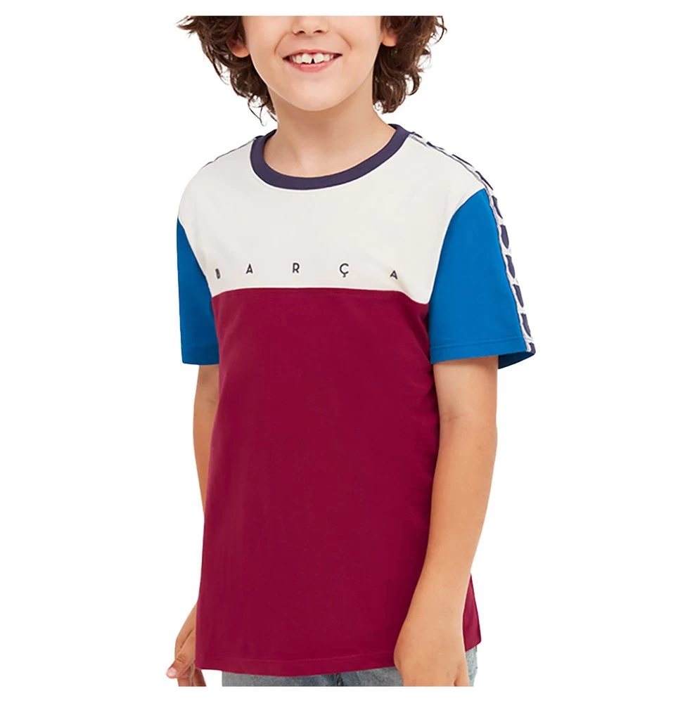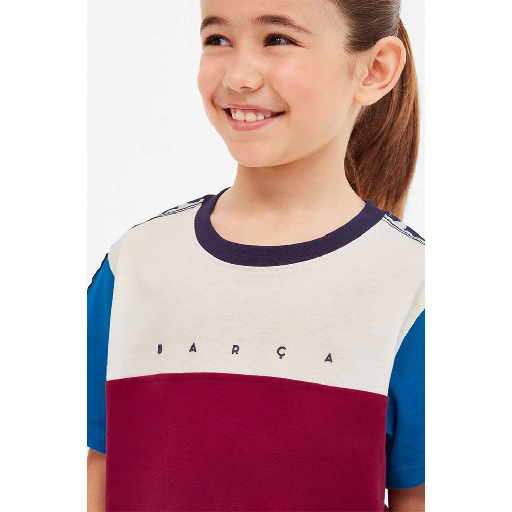 Multi-coloured t-shirt junior with embossed “Barça” lettering. Its cotton fabric makes for a comfortable and lightweight garment. Rounded neckline. Short sleeves featuring strips decorated with outlines of the FC Barcelona crest.