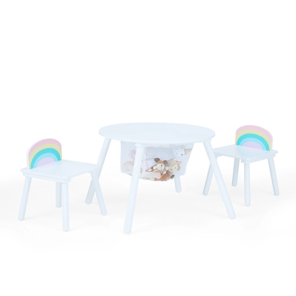This round, white table is perfect for little ones while playing, crafting or eating! Fantasy Fields´ Rainbow Play Table Set provides a large flat surface area and includes two white chairs with pastel colored rainbow seatbacks. The center of the table features a removable lid with an underneath mesh storage bag. The mesh netting is ideal for holding or storing parts and pieces of building sets, blocks, magnetic tiles and more. This multipurpose child-sized table is perfect for kids from snack time to playtime. The table measures 23.75” long, 23.75” deep, and 19.75” tall and each chair measure 12” long, 12” deep, and 15.75” tall.