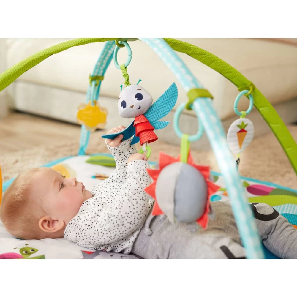 The Gymini Sunny Day Meadow Days 2-in-1 play mat from Tiny Love is a uniquely designed baby activity gym that not only provides hours of fun, but also inspires your baby´s development through various sounds, figures and structures. This baby play gym has been designed to boost your baby’s 7 developmental wonders, including senses, cognitive function, EQ, fine and gross motor skills and more. The included adorable electronic sun toy features engaging lights and a music playing function with 3 different tunes. Additionally, the Tiny Love baby gym mat boasts two expandable arches that adapt to fit growing baby, while providing two different play modes. When the arches are closed, the baby can lie down for visual and tactile stimulation; when the arches are opened, the baby engages in meaningful tummy time while being encouraged to sit up and play with a parent. Colour: Blue and green Material: 40% polyester, 40% acryl and 10% fibreglass Dimensions: 85 x 75 x 45 cm (L x W x H) 2-in-1 baby gym with adjustable arches 16 developmental activities encourage senses, cognitive function, EQ, fine and gross motor skills Baby activated musical toy sun with 3 melodies Mirror for extended tummy time Dragonfly jumpy toy Shiny satin ribbons Playful crinkly mobile Peek-a-boo leaf Easy to grasp teether Machine washable mat With fibreglass rod Battery required: 3 x AG13/LR44 (included) Recommended age: 0-6 months